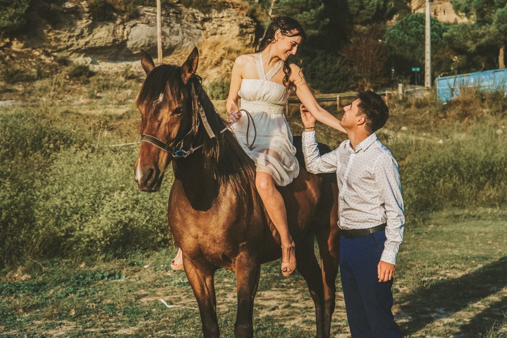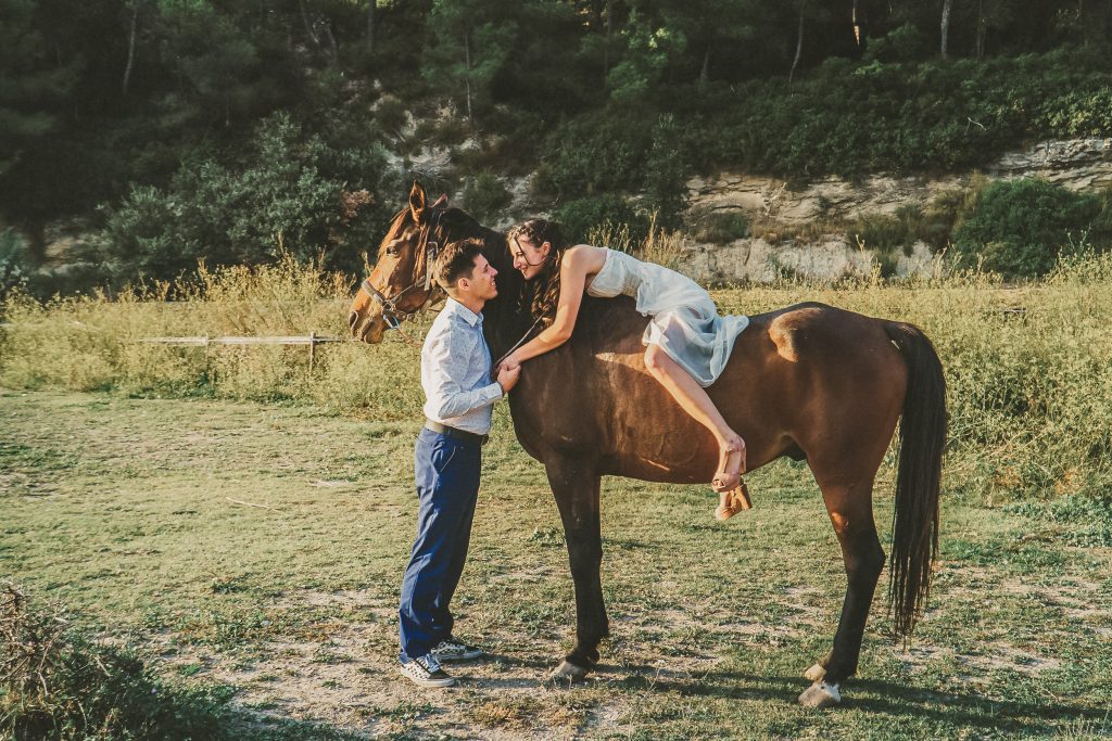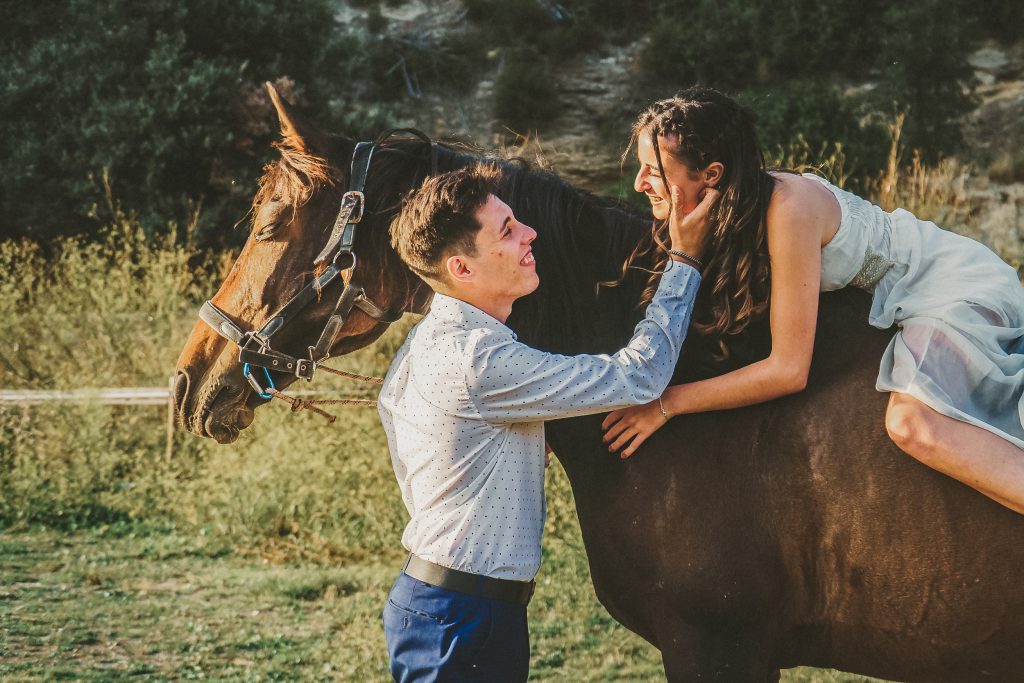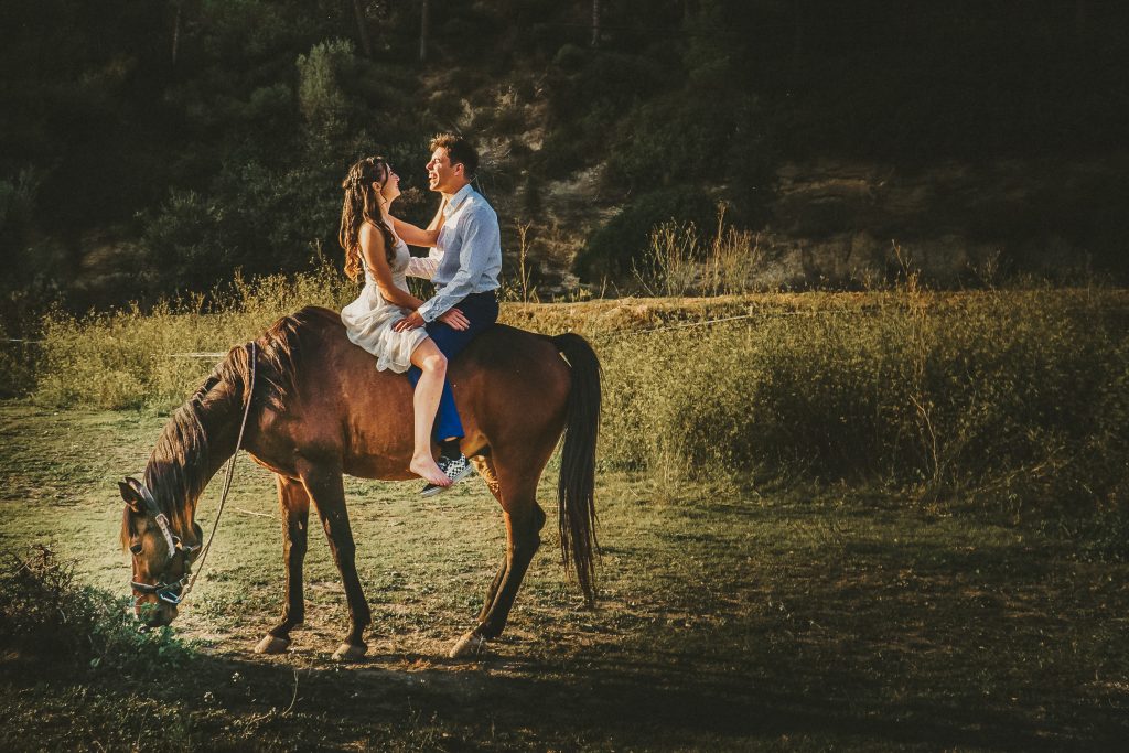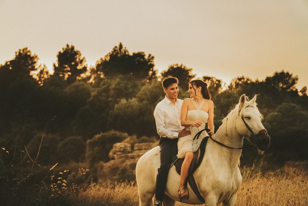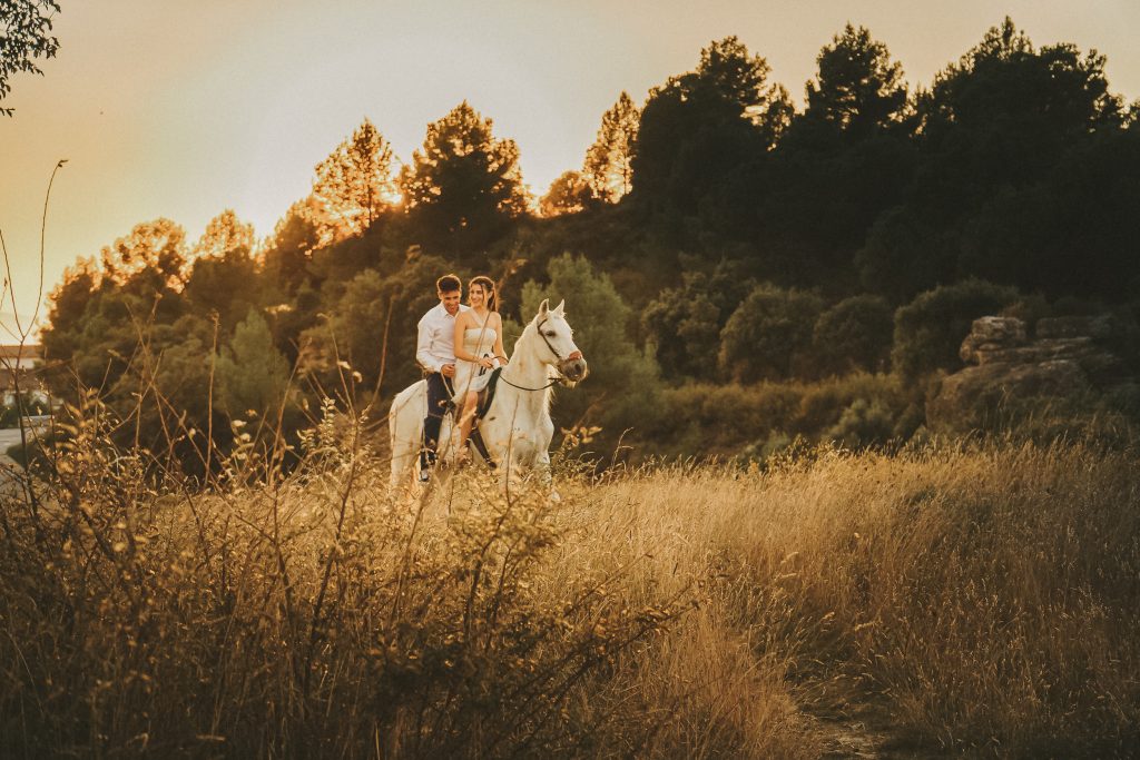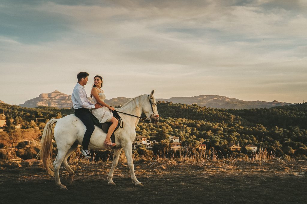 Fran y Montse, una pareja increíblemente divertida y con mucha complicidad, me eligieron para capturar su amor en este entorno natural. Decidimos hacer las fotos montando a caballo, una actividad que los conectó aún más con la naturaleza y con ellos mismos. La luz del atardecer hizo que cada imagen brillara con esa calidez que solo el sol en su despedida puede ofrecer. Fue un momento mágico, y los caballos se convirtieron en unos auténticos protagonistas, participando en la sesión y añadiendo un toque único a las fotos.