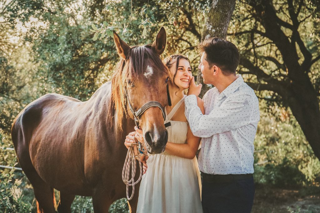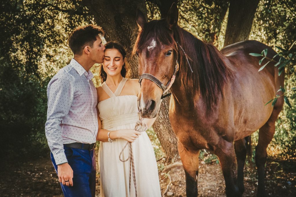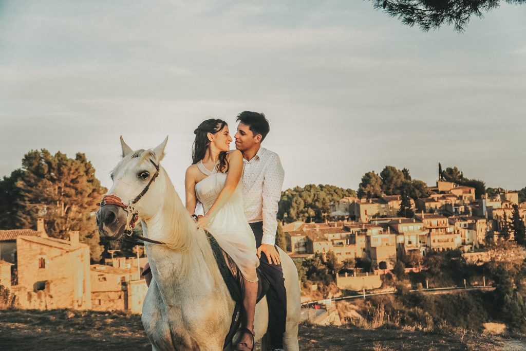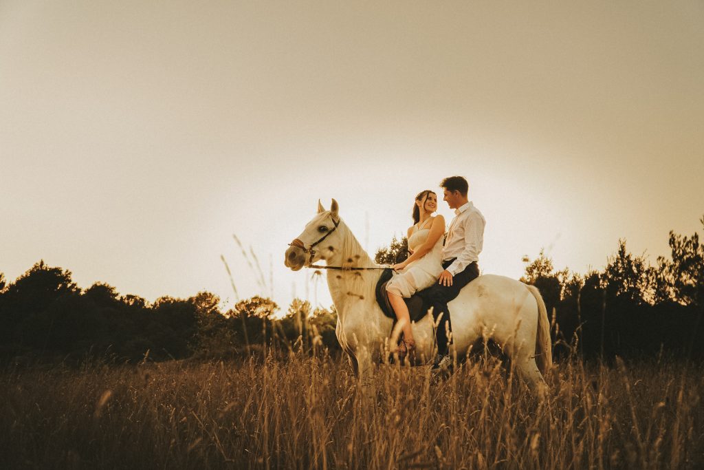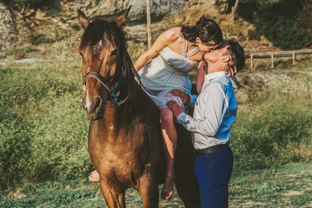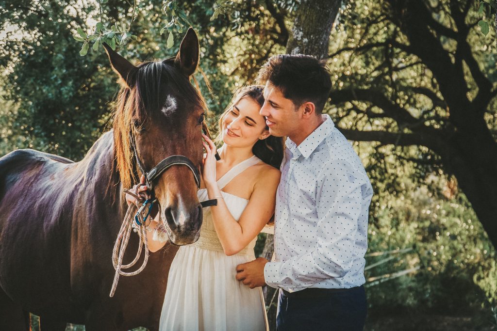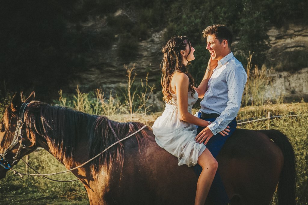 Fran y Montse, una pareja increíblemente divertida y con mucha complicidad, me eligieron para capturar su amor en este entorno natural. Decidimos hacer las fotos montando a caballo, una actividad que los conectó aún más con la naturaleza y con ellos mismos. La luz del atardecer hizo que cada imagen brillara con esa calidez que solo el sol en su despedida puede ofrecer. Fue un momento mágico, y los caballos se convirtieron en unos auténticos protagonistas, participando en la sesión y añadiendo un toque único a las fotos.