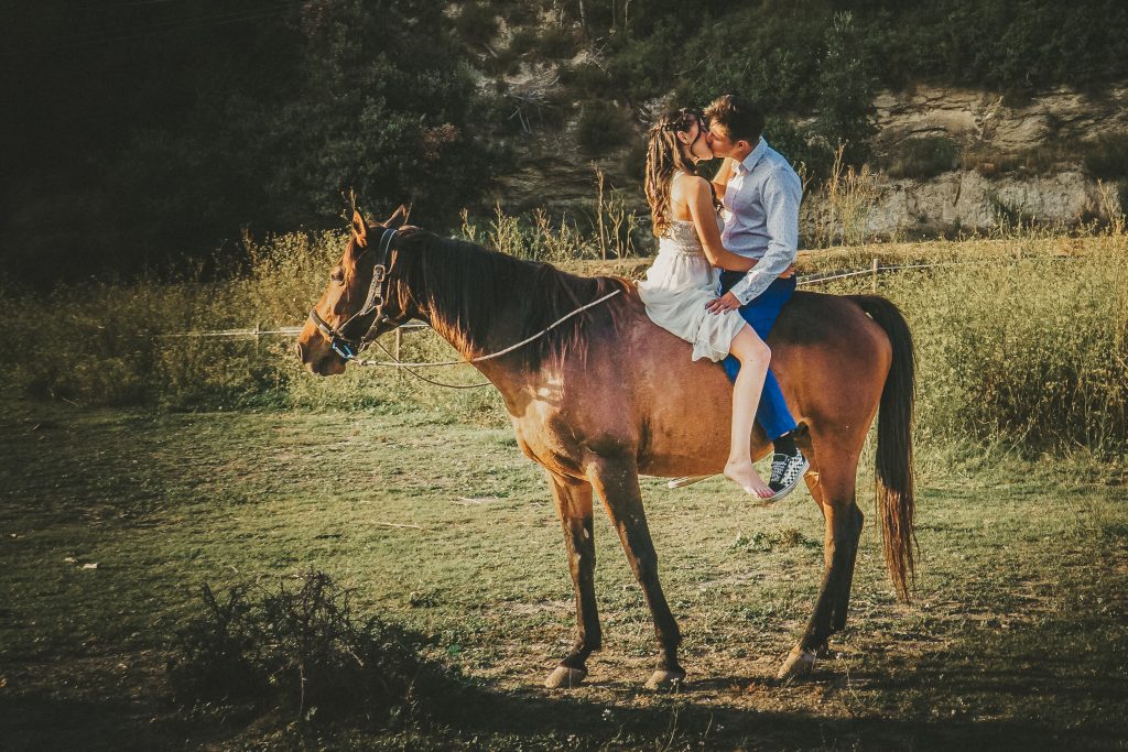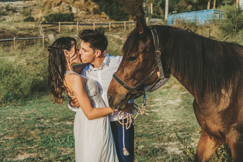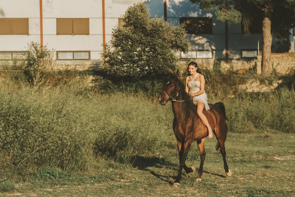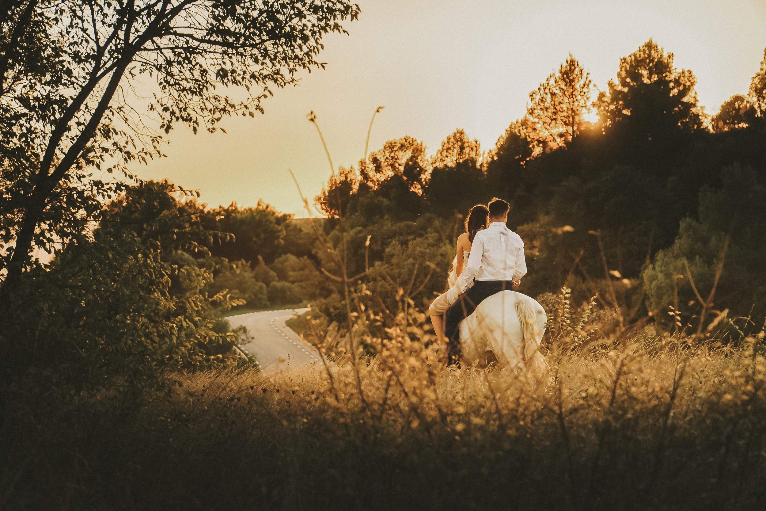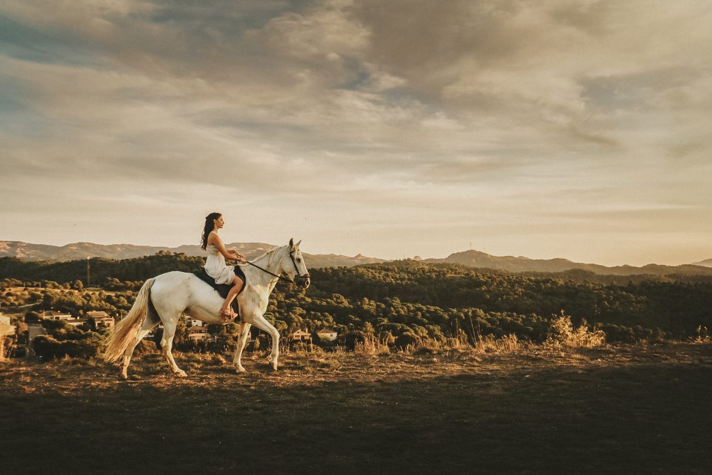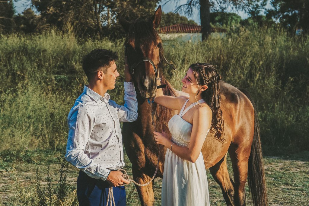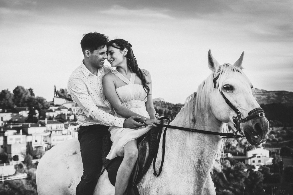 Fran y Montse, una pareja increíblemente divertida y con mucha complicidad, me eligieron para capturar su amor en este entorno natural. Decidimos hacer las fotos montando a caballo, una actividad que los conectó aún más con la naturaleza y con ellos mismos. La luz del atardecer hizo que cada imagen brillara con esa calidez que solo el sol en su despedida puede ofrecer. Fue un momento mágico, y los caballos se convirtieron en unos auténticos protagonistas, participando en la sesión y añadiendo un toque único a las fotos.